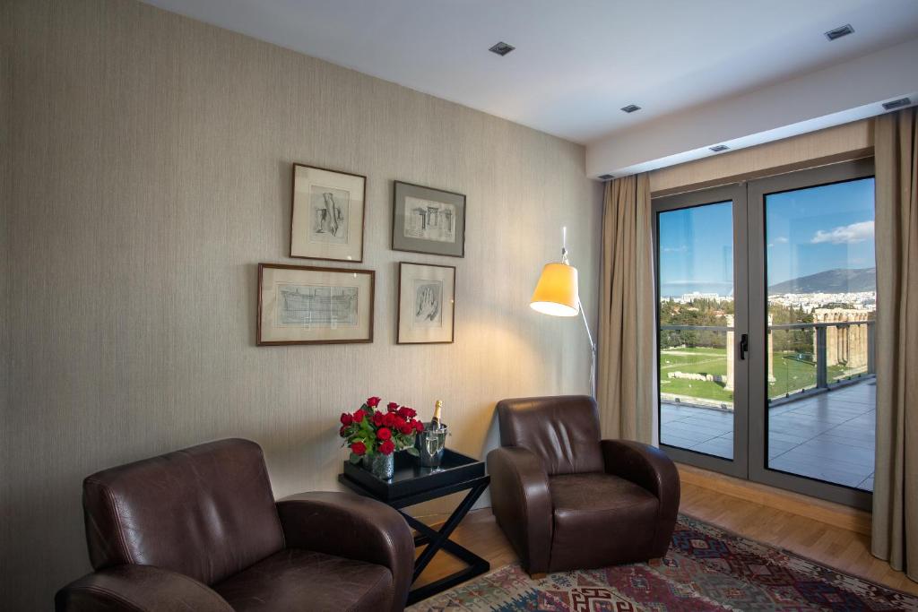 There is a bar/restaurant on the top floor of the hotel, offering breathtaking views of the city. Breakfast can be taken in the roof restaurant, or ordered from room service. There is also a bar in the reception area serving coffees, drinks and light snacks all day. Rooms with Acropolis view are offered on request basis and upon availability. All units are equipped with 27-inch (27 in) LCD flat-screen TV.