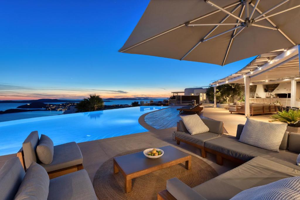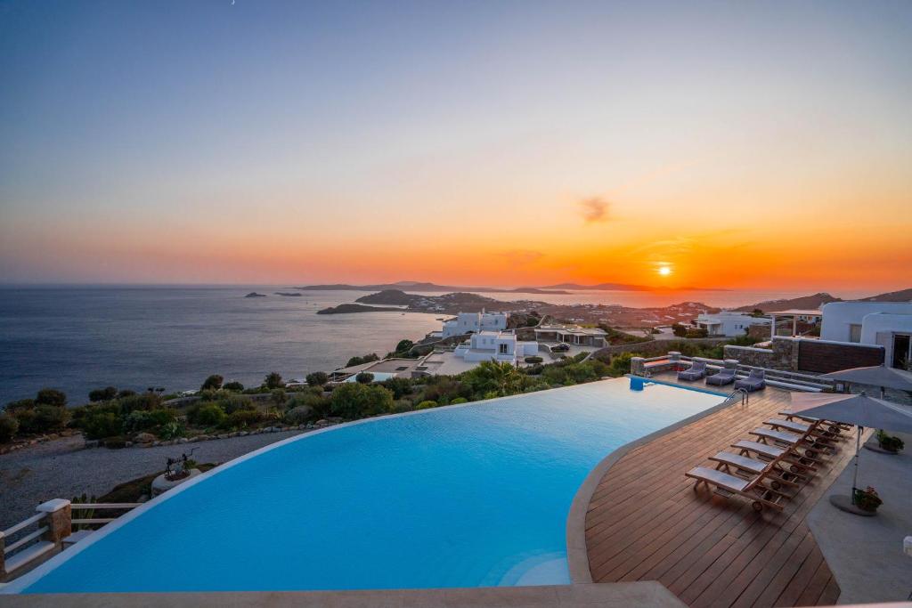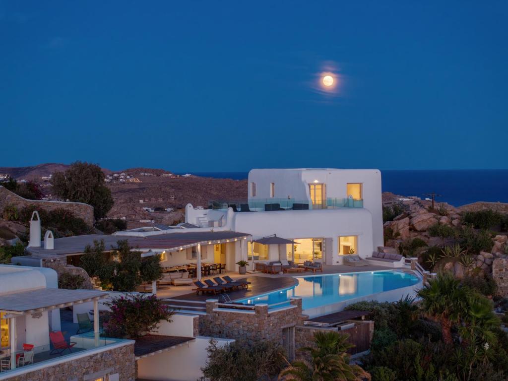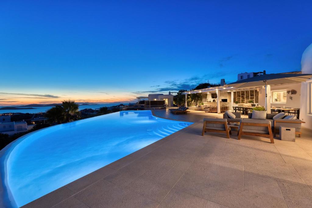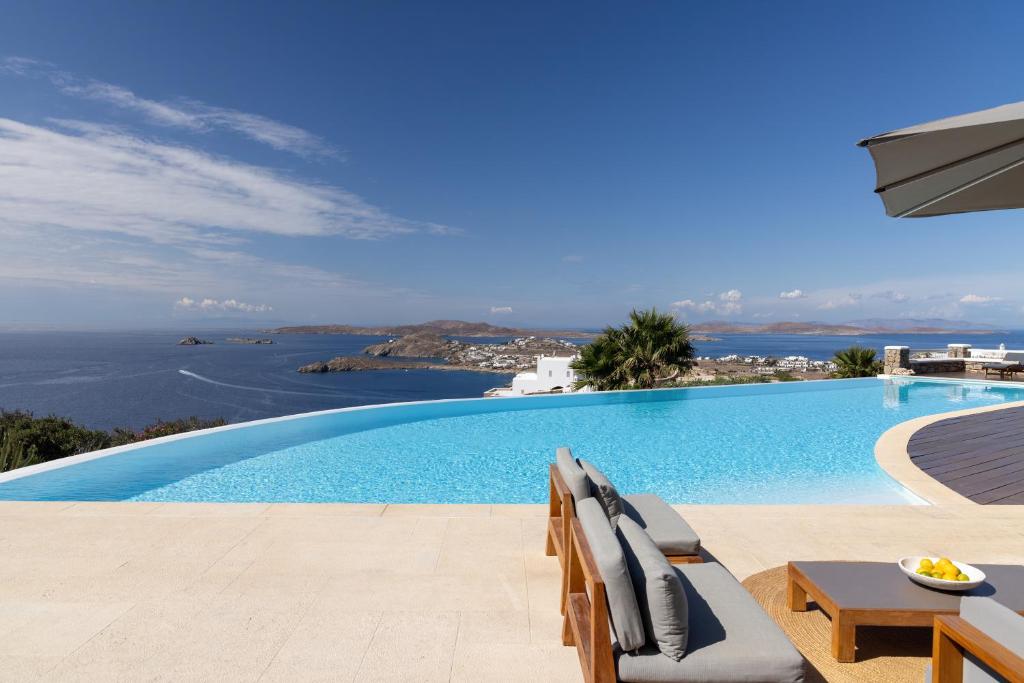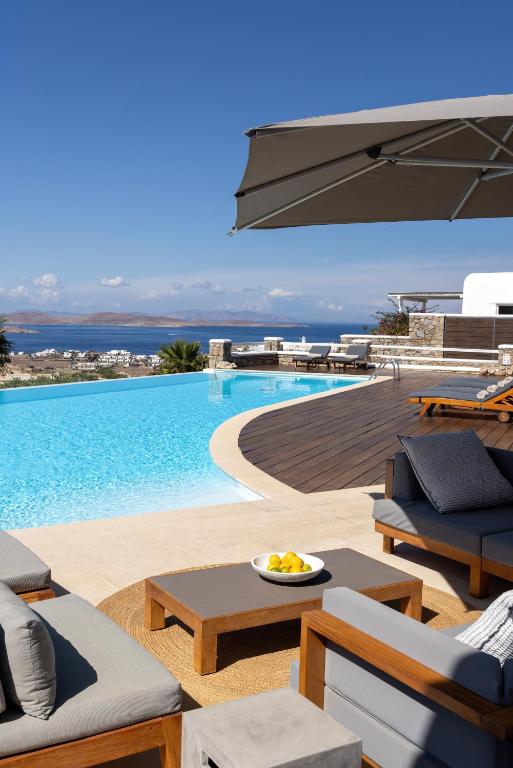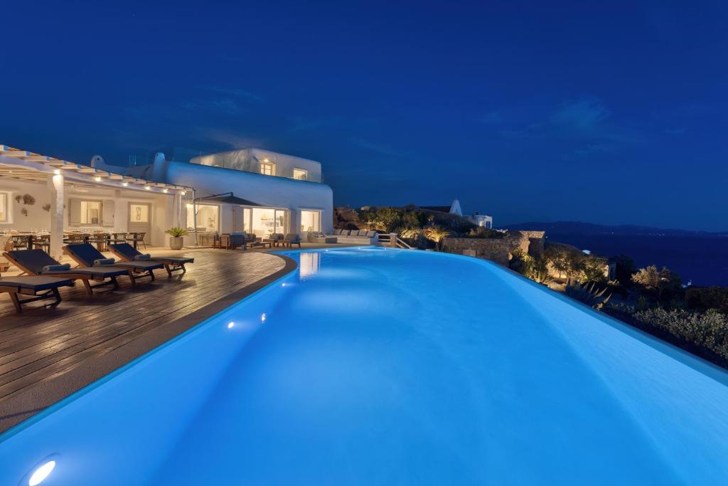 Step into the Alia Villa Complex and experience the best of comfort and luxury in this spacious and elegant villa divided into two buildings featuring 9 bedrooms and an infinity pool (heated pool upon request) with panoramic views to the Aegean Sea! Tip: You can rent the whole property (9 bedrooms) or only the 5-bedroom villa.