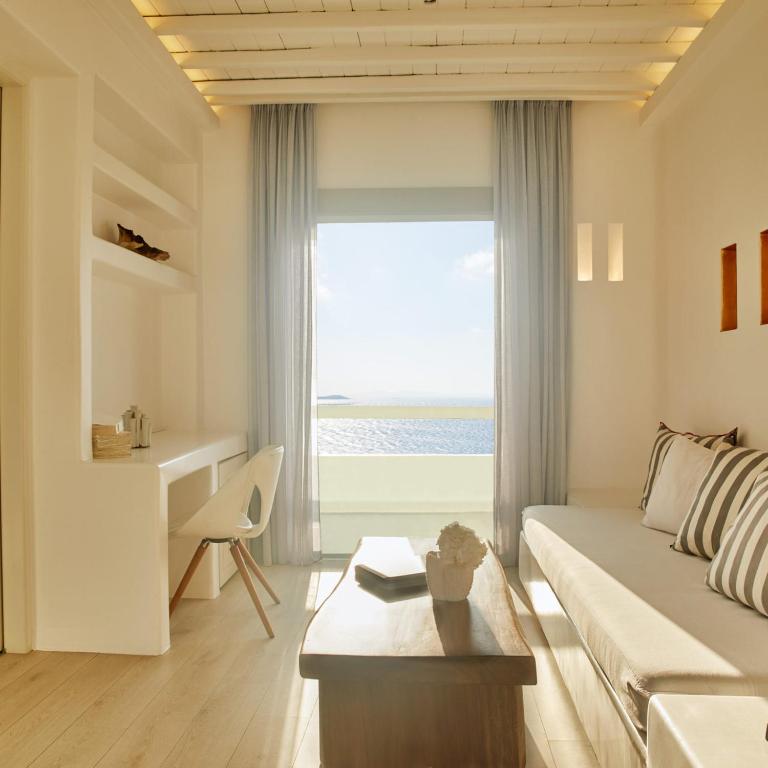 In-room amenities include bathrobe and slippers, flat-screen TV and Simmons bed mattresses. Some units also feature a private pool. Free WiFi is available throughout. The Cavo Tagoo Golden Spa offers traditional body and face treatments, plus chromatotherapy, sauna, steam bath and salon services. Located adjacent to the spa, the fitness center allows guests to keep in top shape during their stay. The Cavo Tagoo restaurant proposes contemporary Mediterranean cuisine created from fresh Greek produce. A buffet breakfast with delicious croissants and tarts is served in the morning. Offering uninterrupted views over Mykonos Town and Dilos Island, the Lounge & Pool Bar area of Cavo Tagoo features an infinity pool with color-changing lighting, wooden decks that seem to float on water. The hotel’s 24-hour front desk can arrange for baby-sitting, laundry service and newspaper delivered to your door. Guest services include concierge service and doctor on call. Free on-site parking is available.