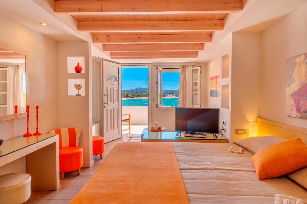 They are equipped with a satellite LCD TV, DVD player and mini-bar. The bathroom features a hydromassage shower cabin and free toiletries. The seaside restaurant serves fresh fish and other Mediterranean flavors prepared with local products. Guests can start their day with the breakfast served either in the breakfast area or by the pool, including local and organic products. Exotic cocktails and drinks are served at the bar. The main town of Naxos is 656 feet away and the port is at 2625 feet. Naxos Airport is 1.2 mi away. Free WiFi is provided throughout the hotel and free on-site parking is possible.