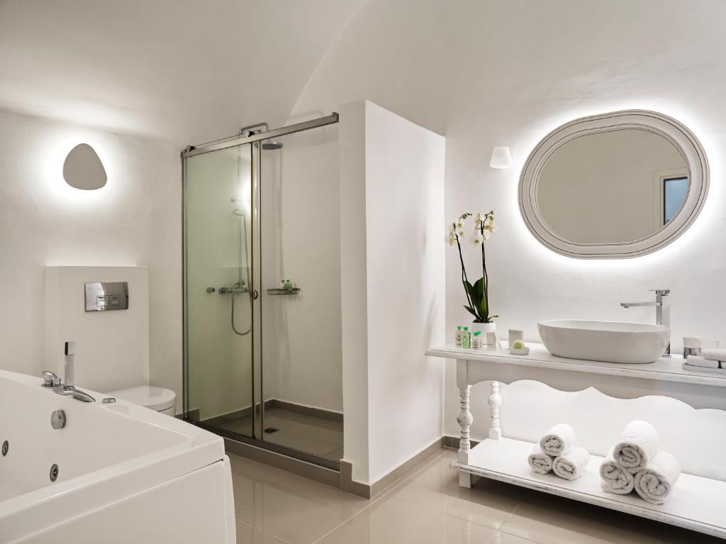 All rooms are air conditioned and come with satellite TV and CD player. Guests also enjoy a mini-bar, as well as a mini wine cellar and a fridge. The boutique hotel’s facilities include open-air and indoor hot tubs and swimming pools. Free Wi-Fi internet access is available throughout the hotel. American breakfast with champagne is served in your room, or on your private veranda. Guests receive wine and fruit as a welcome gift. Katikies Hotel is 11 mi from Santorini airport and Athinios port.