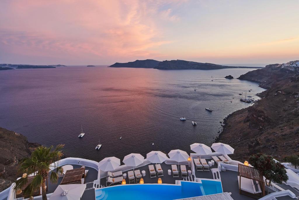 This 5-star hotel, with its traditional architecture and its multi-leveled terraces, perches from the cliff, overlooking the blue waters of the Aegean Sea and the dramatic volcano island. The recently refurbished Kirini Santorini features additional luxury amenities, such as the new Spa and the pool area with not only lounges with sea view, but relaxing facilities carved into the cliff.