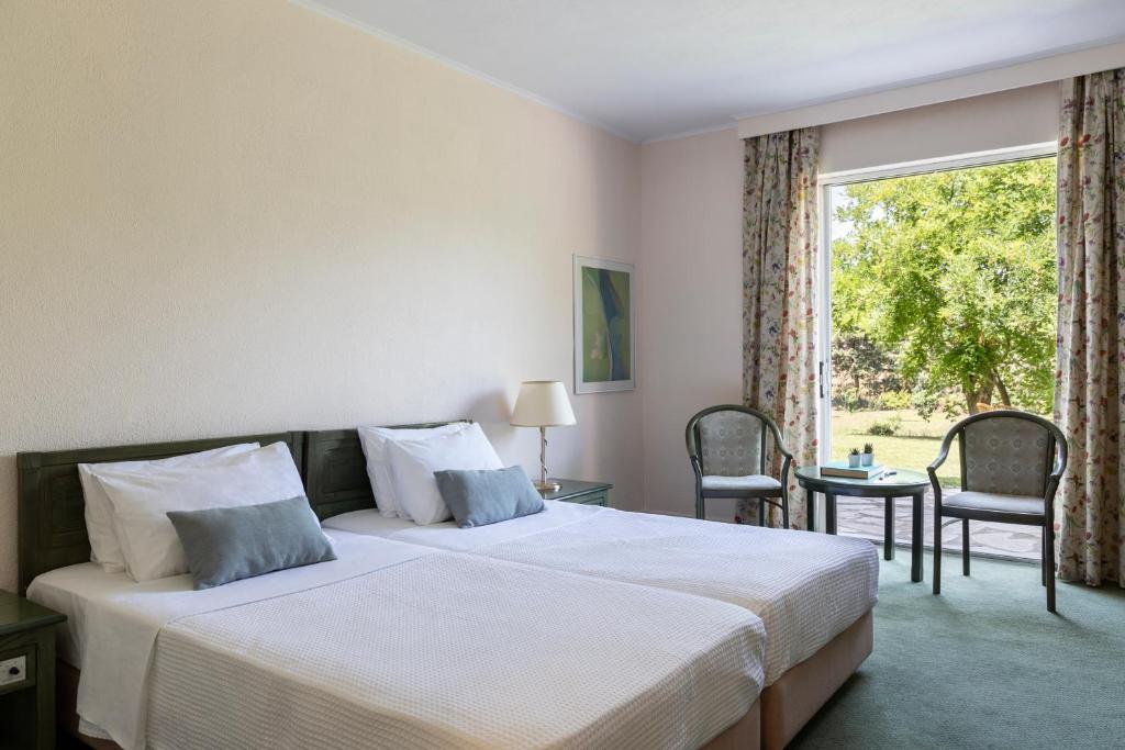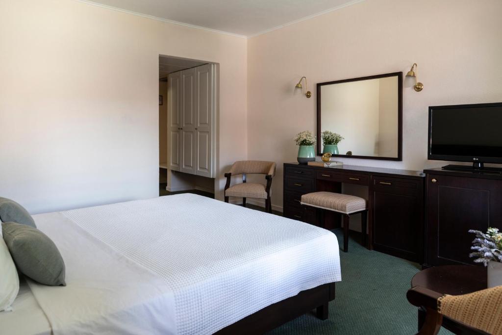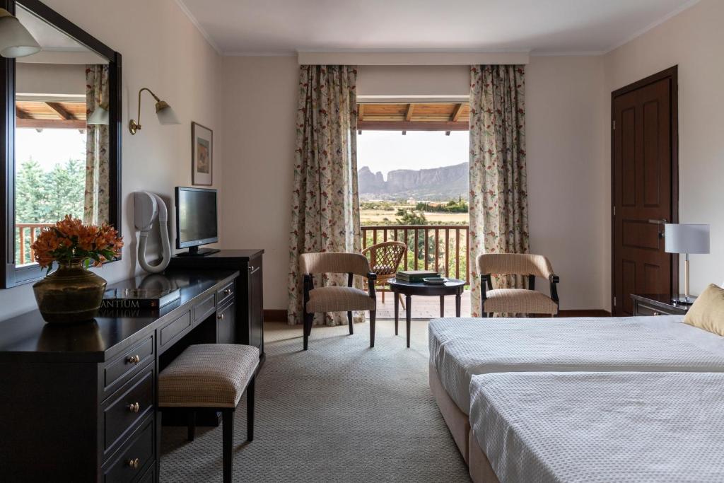 The 4-star Amalia Hotel Kalambaka features an Olympic-size swimming pool and a furnished sun terrace surrounded by lush gardens. Made of traditional materials and fitted with beamed ceilings, the hotel's public areas include a lounge bar with fireplace, a piano bar and 2 restaurants. The spacious rooms of Amalia Hotel Kalampaka are equipped with air conditioning, a satellite TV and a mini fridge.